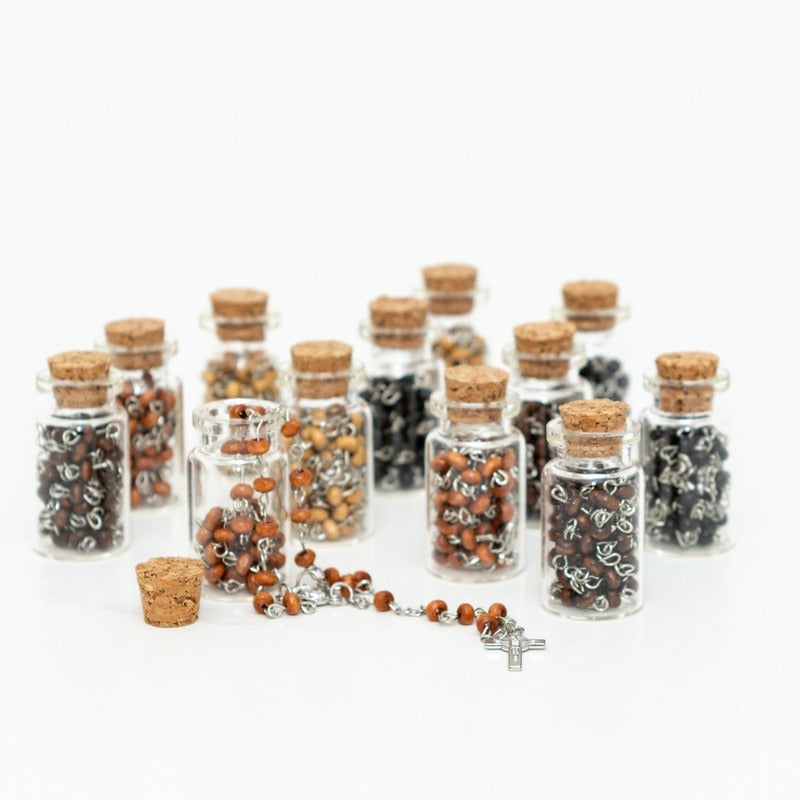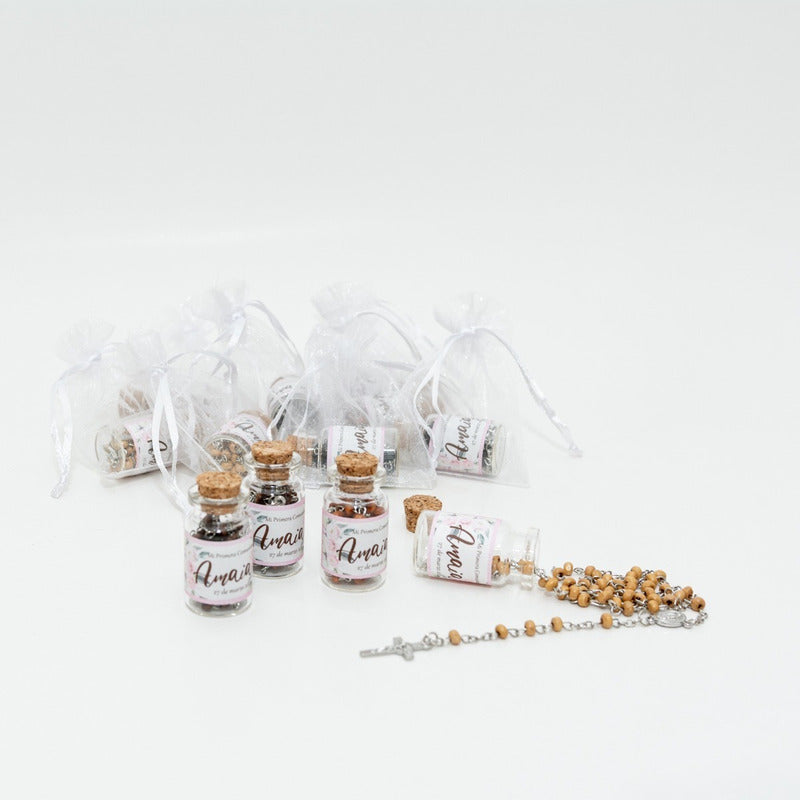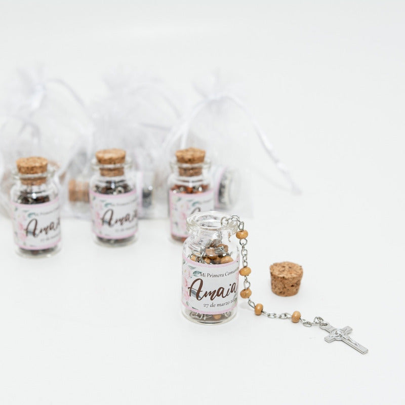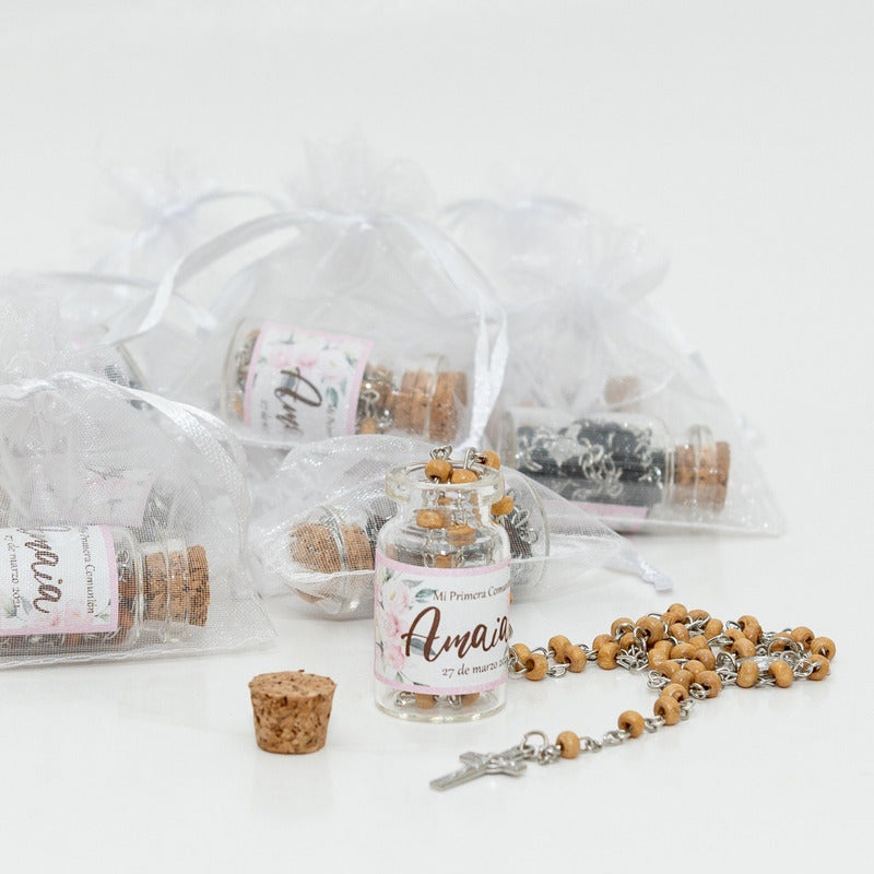Este pack incluye 12 rosarios de madera presentados en botellas de cristal con tapa de corcho, perfectos como detalles para bodas, primeras comuniones, bautizos o regalos especiales para familiares y amigos. Cada unidad contiene: un frasco de cristal con tapón de corcho, un rosario de madera, una bolsa de organza y una etiqueta personalizada con el nombre y la fecha del evento. Al realizar tu compra, podrás contactarnos para proporcionarnos los datos necesarios y personalizar los rosarios a tu gusto. Una opción sofisticada y significativa para tus celebraciones.