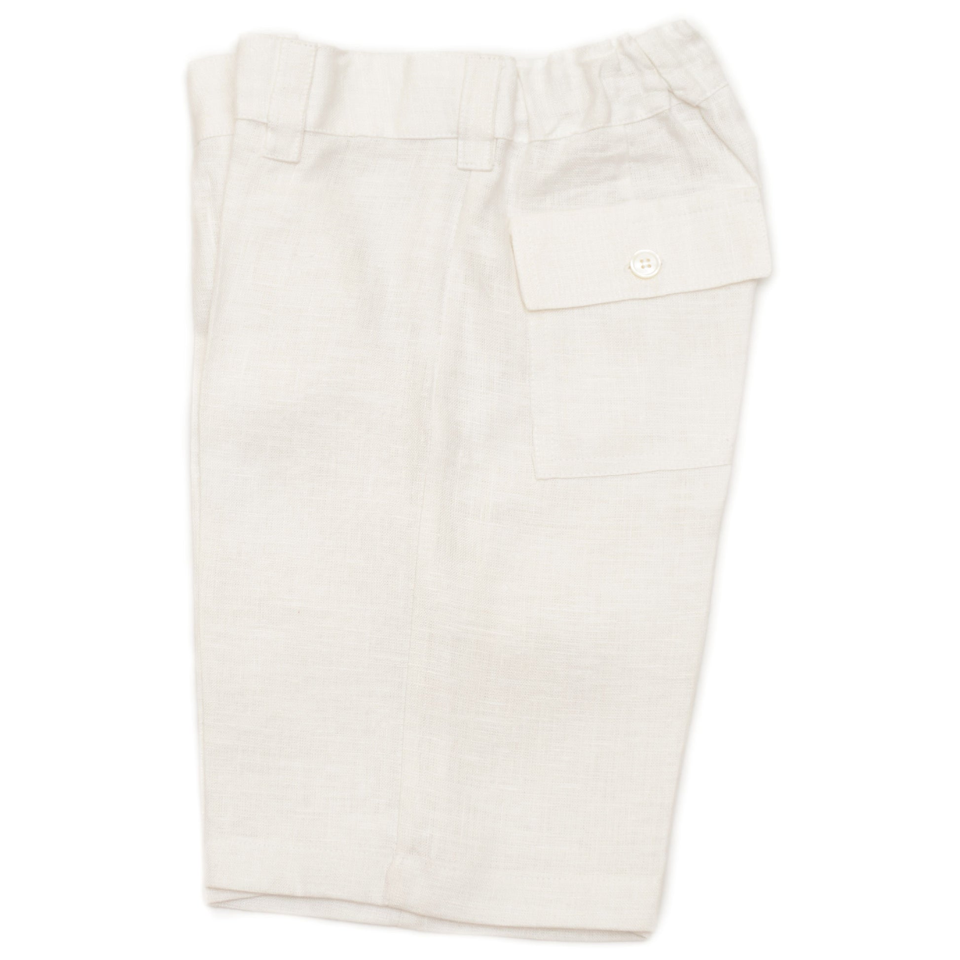 Estas bermudas de lino italiano se destacan por su comodidad óptima y su corte recto. Con una cintura ajustable y dos bolsillos traseros de parche con botón, no solo son elegantes sino también prácticas. Perfectas para eventos y ceremonias especiales, mantendrán a los niños y jóvenes frescos y con estilo durante el verano. ¡Haz una declaración de moda con estas bermudas de alta calidad!
