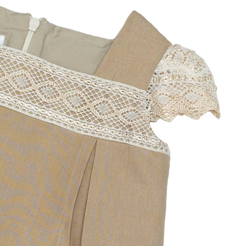 Vestido 100% lino italiano en color capuchino. Entredos de bolillo español en dos tonos en el talle. Punta también de bolillo formando mangas cortas y en la parte inferior de la falda. Cuello cuadrado con forro en algodón poliester. Cierre en espalda.